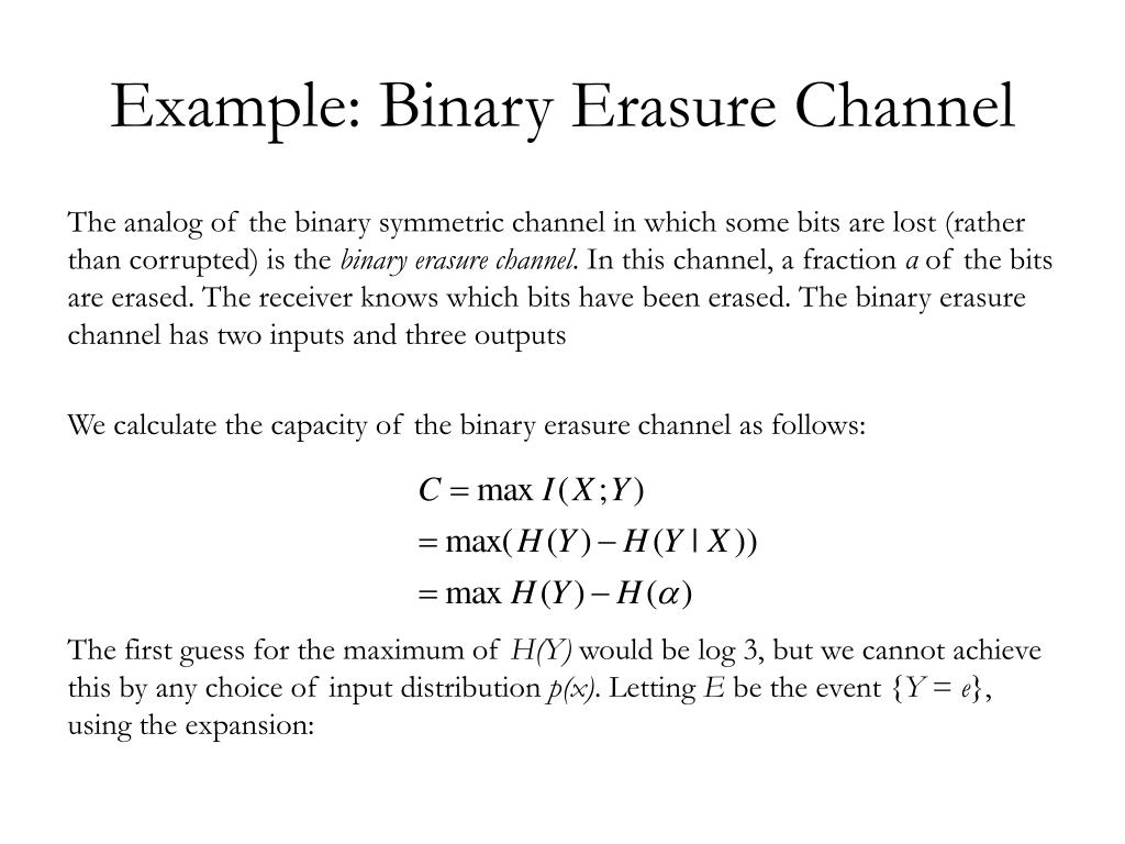 Example: Binary Erasure Channel • The analog of the binary symmetric channel in which some bits are lost (rather than corrupted) is the binary erasure channel. In this channel, a fraction α of the bits are erased. The receiver knows which bits have been erased. The binary erasure channel has two inputs and three outputs • We calculate the capacity of the binary erasure channel as follows: • The first guess for the maximum of H(Y) would be log 3, but we cannot achieve this by any choice of input distribution p(x). Letting E be the event {Y = e}, using the expansion: