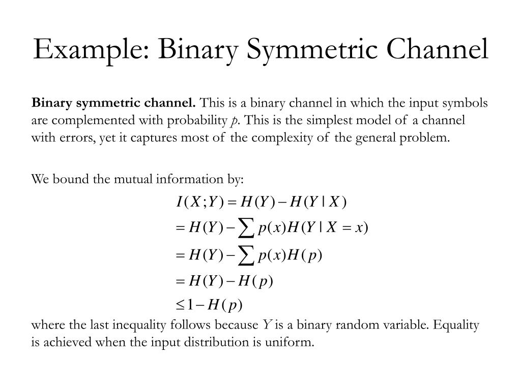 Example: Binary Symmetric Channel • Binary symmetric channel. This is a binary channel in which the input symbols are complemented with probability p. This is the simplest model of a channel with errors, yet it captures most of the complexity of the general problem. • We bound the mutual information by: • where the last inequality follows because Y is a binary random variable. Equality is achieved when the input distribution is uniform.