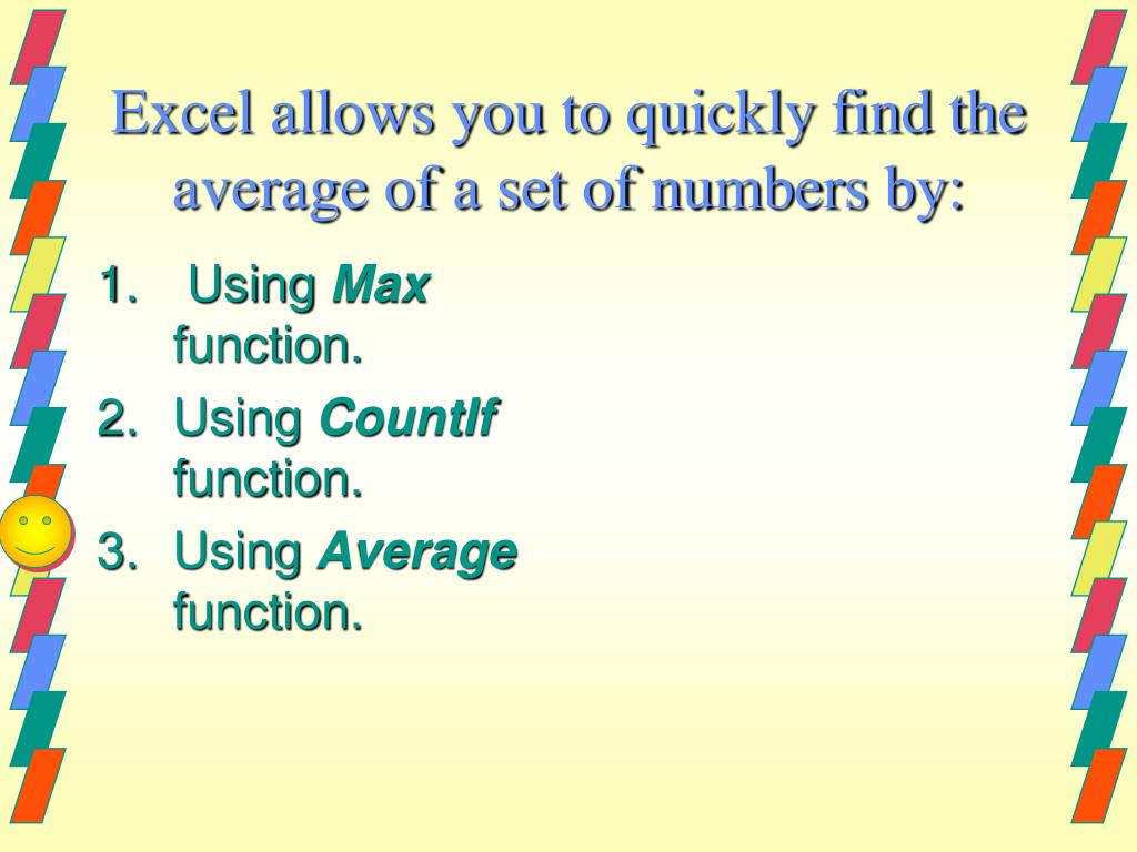 Excel allows you to quickly find the average of a set of numbers by: • Using Max function. • Using CountIf function. • Using Average function.