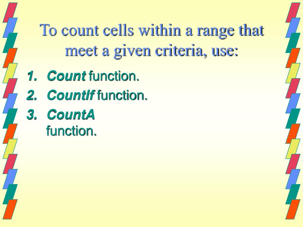 To count cells within a range that meet a given criteria, use: • Count function. • CountIf function. • CountA function.