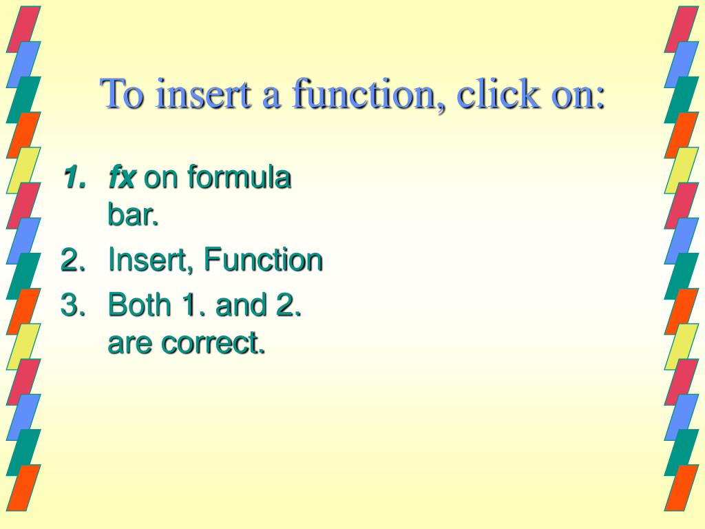 To insert a function, click on: • fx on formula bar. • Insert, Function • Both 1. and 2. are correct.
