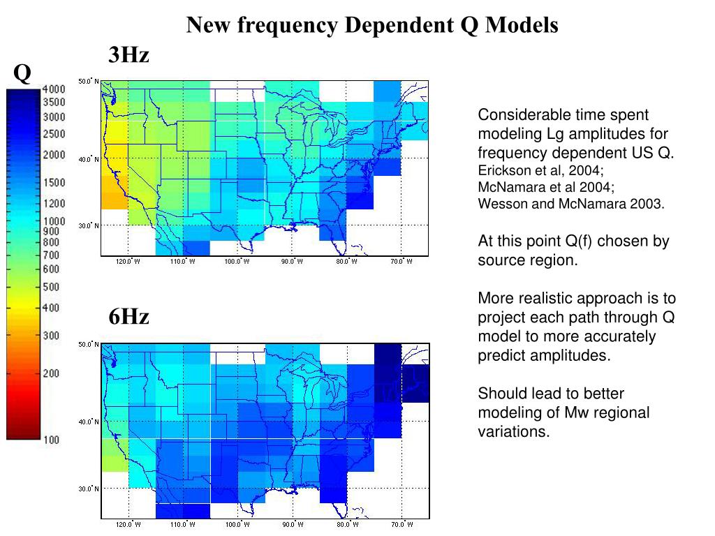New frequency Dependent Q Models 3Hz Q Considerable time spent modeling Lg amplitudes for frequency dependent US Q. Erickson et al, 2004; McNamara et al 2004; Wesson and McNamara 2003. At this point Q(f) chosen by source region. More realistic approach is to project each path through Q model to more accurately predict amplitudes. Should lead to better modeling of Mw regional variations. 6Hz