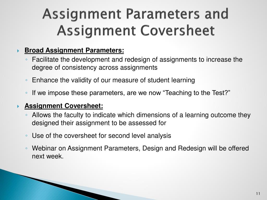 Assignment Parameters and Assignment Coversheet • Broad Assignment Parameters: • Facilitate the development and redesign of assignments to increase the degree of consistency across assignments • Enhance the validity of our measure of student learning • If we impose these parameters, are we now “Teaching to the Test?” • Assignment Coversheet: • Allows the faculty to indicate which dimensions of a learning outcome they designed their assignment to be assessed for • Use of the coversheet for second level analysis • Webinar on Assignment Parameters, Design and Redesign will be offered next week.