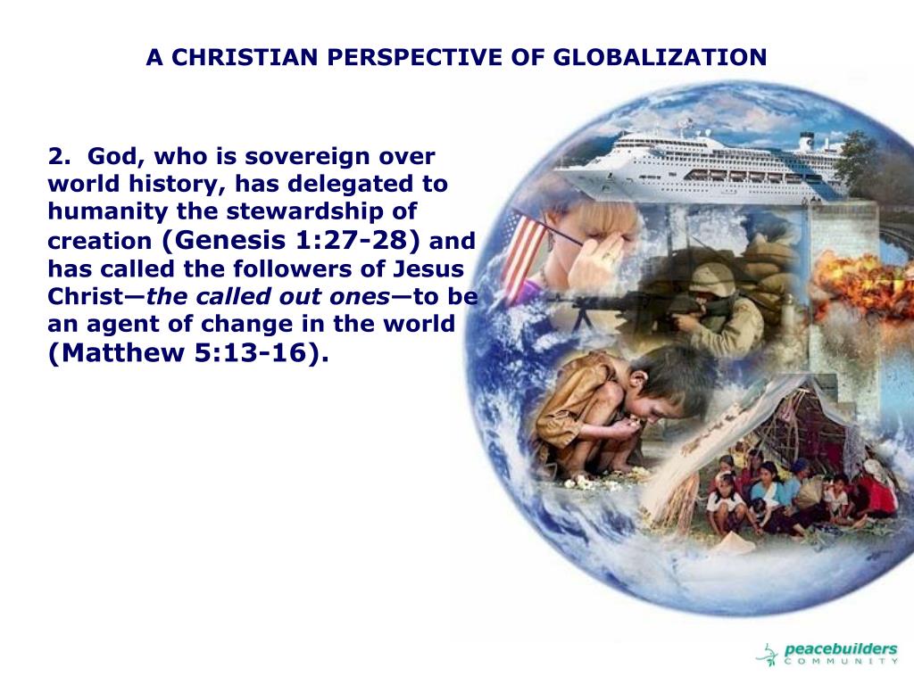 A CHRISTIAN PERSPECTIVE OF GLOBALIZATION 2. God, who is sovereign over world history, has delegated to humanity the stewardship of creation (Genesis 1:27-28) and has called the followers of Jesus Christ—the called out ones—to be an agent of change in the world (Matthew 5:13-16).