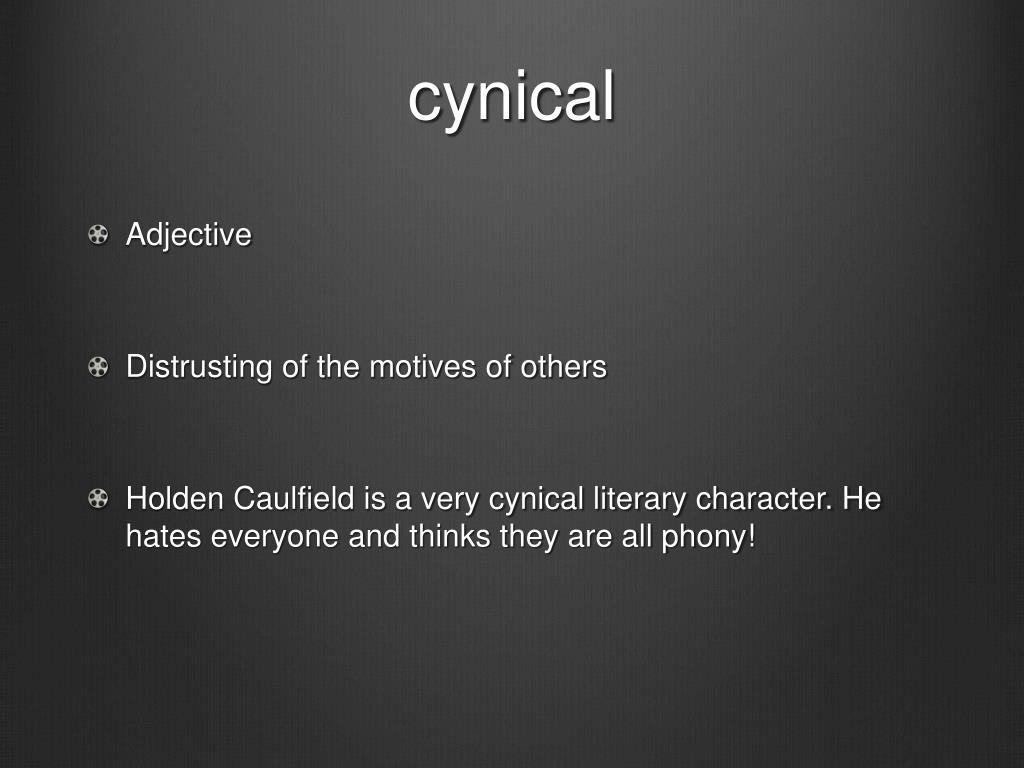 cynical • Adjective • Distrusting of the motives of others • Holden Caulfield is a very cynical literary character. He hates everyone and thinks they are all phony!