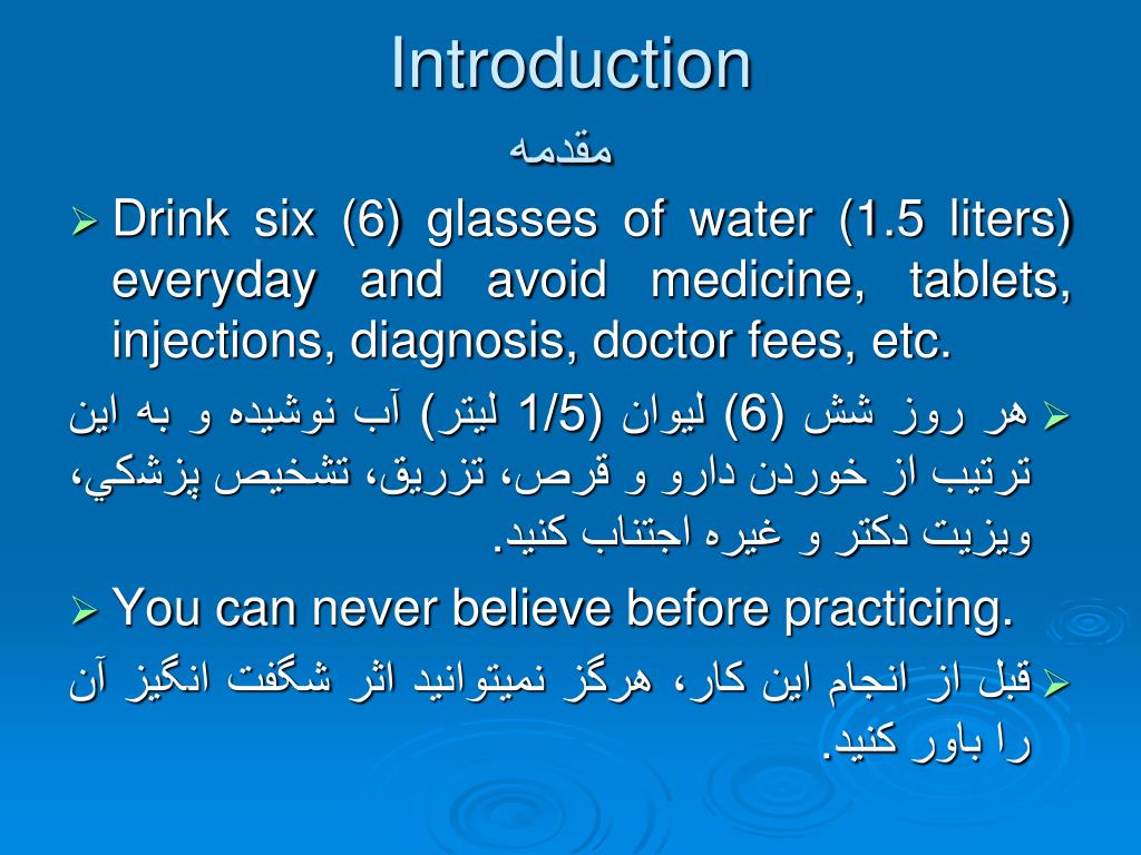 Introductionمقدمه • Drink six (6) glasses of water (1.5 liters) everyday and avoid medicine, tablets, injections, diagnosis, doctor fees, etc. • هر روز شش (6) ليوان (1/5 ليتر) آب نوشيده و به اين ترتيب از خوردن دارو و قرص، تزريق، تشخيص پزشكي، ويزيت دكتر و غيره اجتناب كنيد. • You can never believe before practicing. • قبل از انجام اين كار، هرگز نميتوانيد اثر شگفت انگيز آن را باور كنيد.