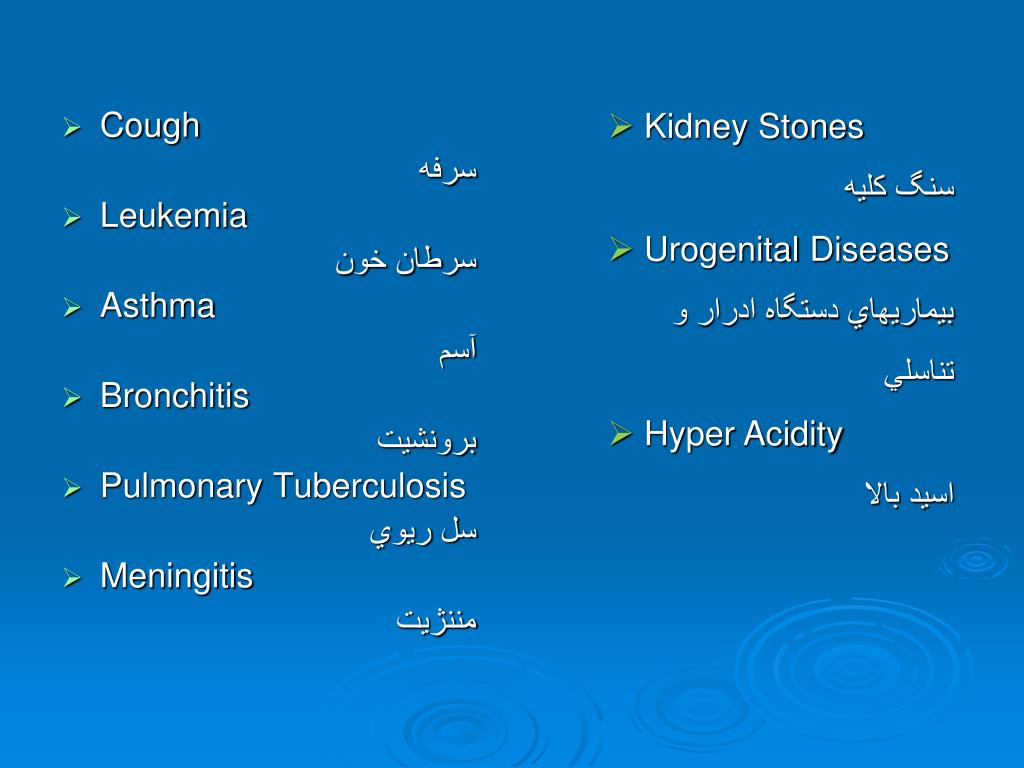 Kidney Stones • سنگ كليه • Urogenital Diseases • بيماريهاي دستگاه ادرار و تناسلي • Hyper Acidity • اسيد بالا • Cough سرفه • Leukemia سرطان خون • Asthma آسم • Bronchitis برونشيت • Pulmonary Tuberculosis سل ريوي • Meningitis مننژيت