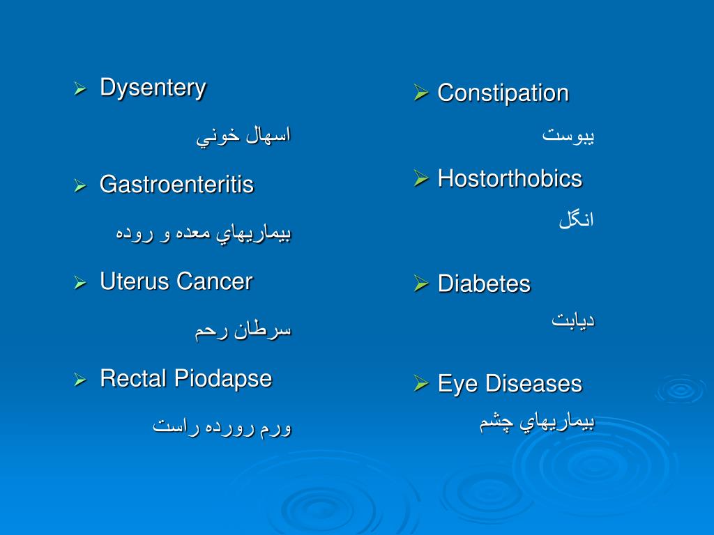 Constipation • يبوست • Hostorthobics • انگل • Diabetes • ديابت • Eye Diseases • بيماريهاي چشم • Dysentery اسهال خوني • Gastroenteritis بيماريهاي معده و روده • Uterus Cancer سرطان رحم • Rectal Piodapse ورم رورده راست