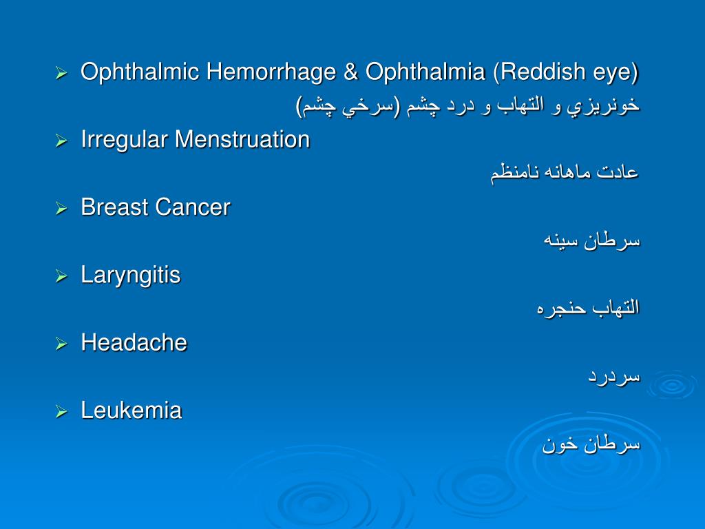 Ophthalmic Hemorrhage & Ophthalmia (Reddish eye) خونريزي و التهاب و درد چشم (سرخي چشم) • Irregular Menstruation عادت ماهانه نامنظم • Breast Cancer سرطان سينه • Laryngitis التهاب حنجره • Headache سردرد • Leukemia سرطان خون