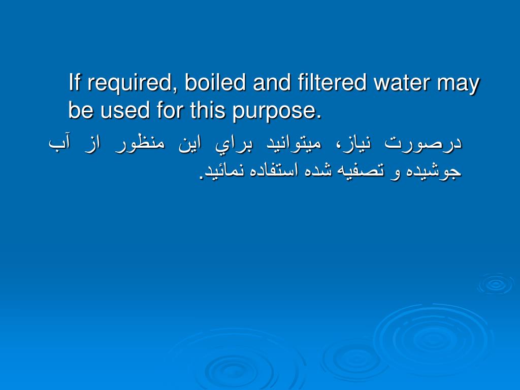 If required, boiled and filtered water may be used for this purpose. درصورت نياز، ميتوانيد براي اين منظور از آب جوشيده و تصفيه شده استفاده نمائيد.