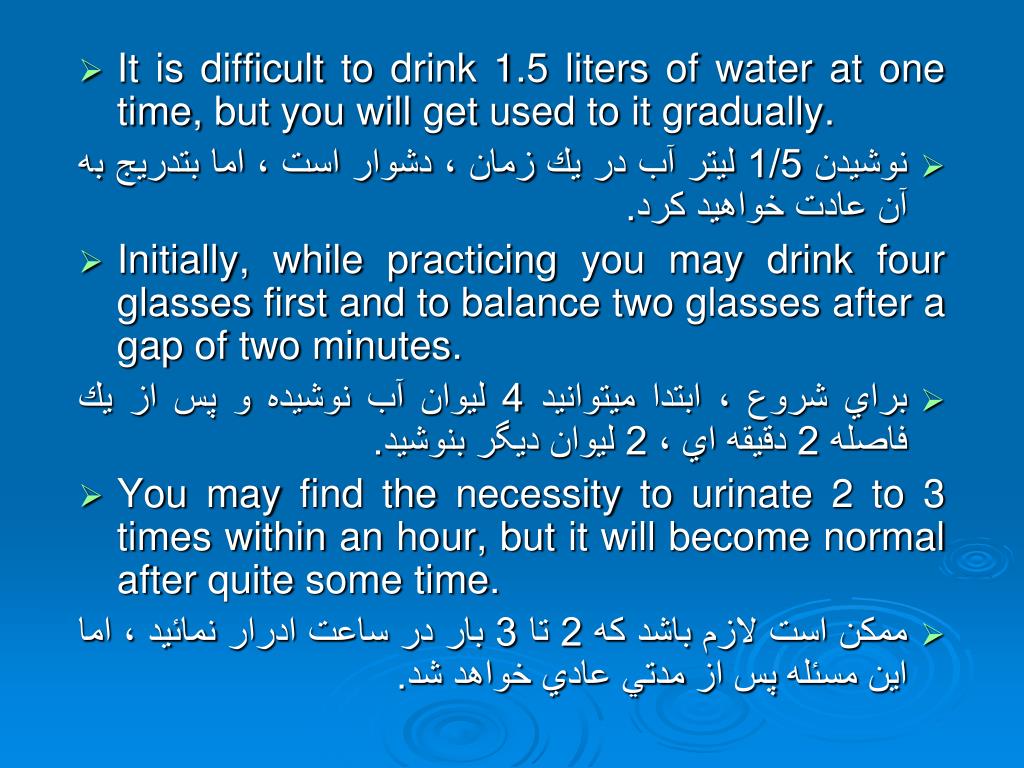 It is difficult to drink 1.5 liters of water at one time, but you will get used to it gradually. • نوشيدن 1/5 ليتر آب در يك زمان ، دشوار است ، اما بتدريج به آن عادت خواهيد كرد. • Initially, while practicing you may drink four glasses first and to balance two glasses after a gap of two minutes. • براي شروع ، ابتدا ميتوانيد 4 ليوان آب نوشيده و پس از يك فاصله 2 دقيقه اي ، 2 ليوان ديگر بنوشيد. • You may find the necessity to urinate 2 to 3 times within an hour, but it will become normal after quite some time. • ممكن است لازم باشد كه 2 تا 3 بار در ساعت ادرار نمائيد ، اما اين مسئله پس از مدتي عادي خواهد شد.