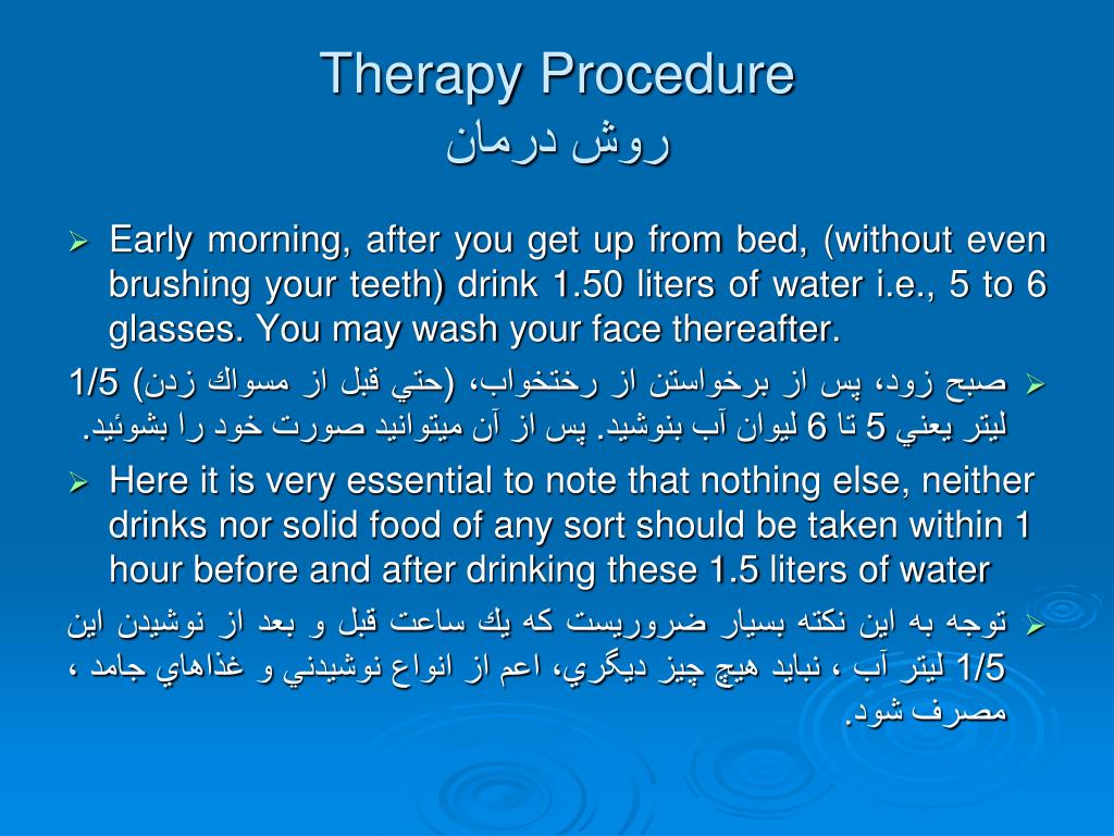 Therapy Procedureروش درمان • Early morning, after you get up from bed, (without even brushing your teeth) drink 1.50 liters of water i.e., 5 to 6 glasses. You may wash your face thereafter. • صبح زود، پس از برخواستن از رختخواب، (حتي قبل از مسواك زدن) 1/5 ليتر يعني 5 تا 6 ليوان آب بنوشيد. پس از آن ميتوانيد صورت خود را بشوئيد. • Here it is very essential to note that nothing else, neither drinks nor solid food of any sort should be taken within 1 hour before and after drinking these 1.5 liters of water • توجه به اين نكته بسيار ضروريست كه يك ساعت قبل و بعد از نوشيدن اين 1/5 ليتر آب ، نبايد هيچ چيز ديگري، اعم از انواع نوشيدني و غذاهاي جامد ، مصرف شود.