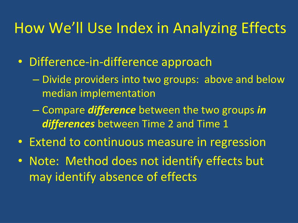 How We’ll Use Index in Analyzing Effects Difference-in-difference approach Divide providers into two groups: above and below median implementation Compare difference between the two groups indifferences between Time 2 and Time 1 Extend to continuous measure in regression Note: Method does not identify effects but may identify absence of effects