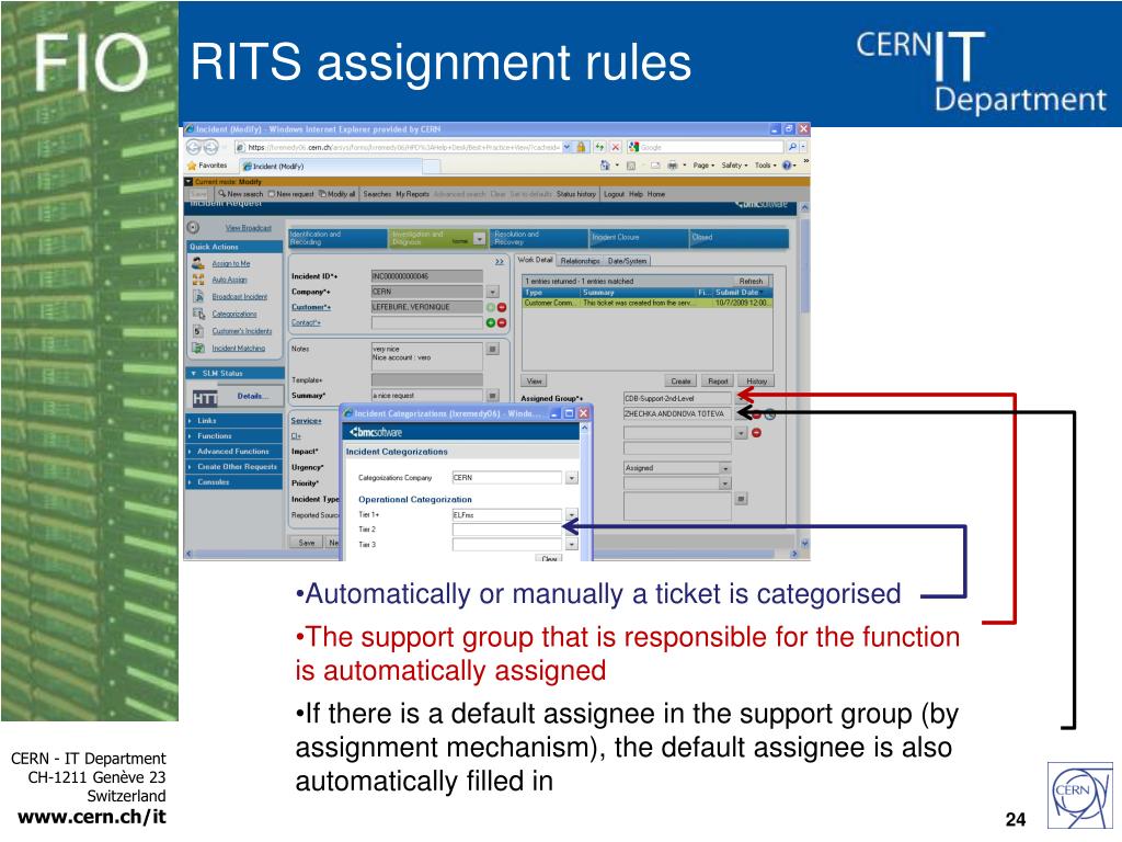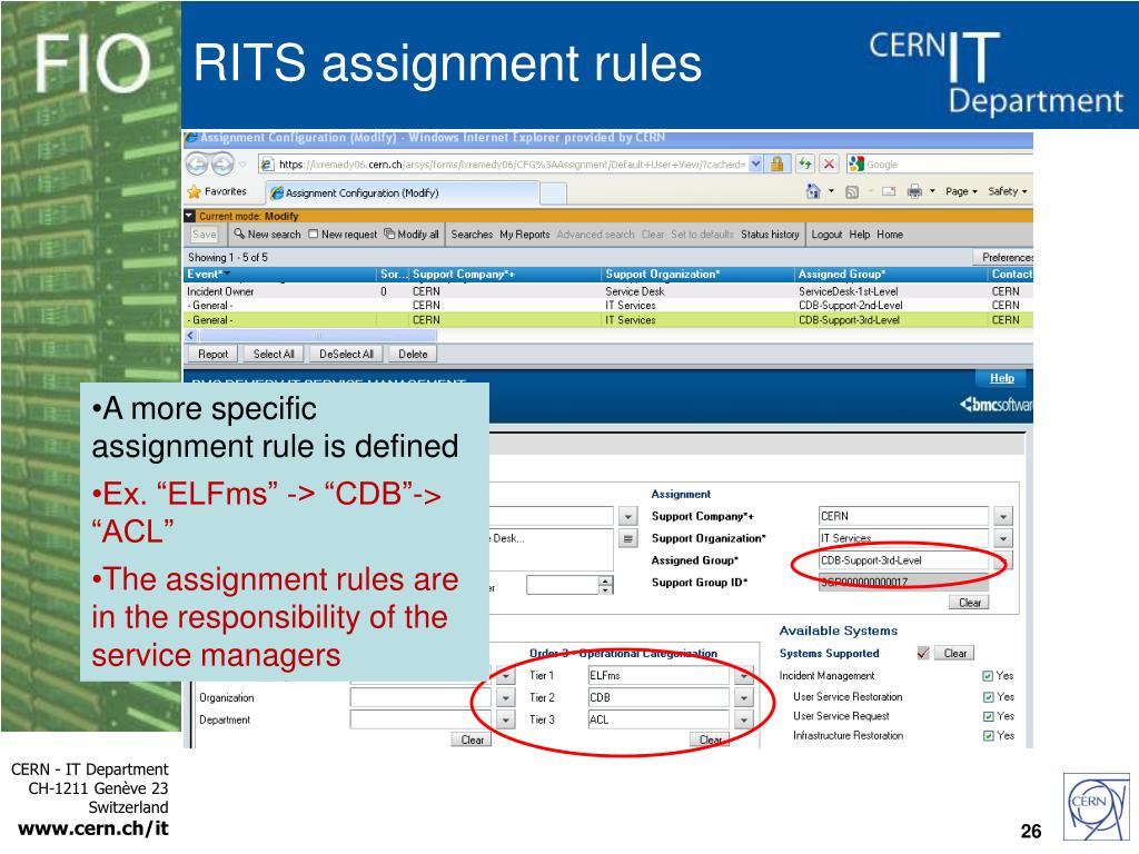 RITS assignment rules • A support group is responsible for incidents categorised in the given categorisation • And all incidents with more precise categorisation that the defined one • Ex. “ELFms” -> “General” • unless…. 25