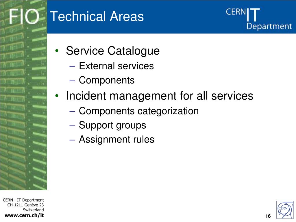 Technical Areas • Service Catalogue • External services • Components • Incident management for all services • Components categorisation • Support groups • Assignment rules 2