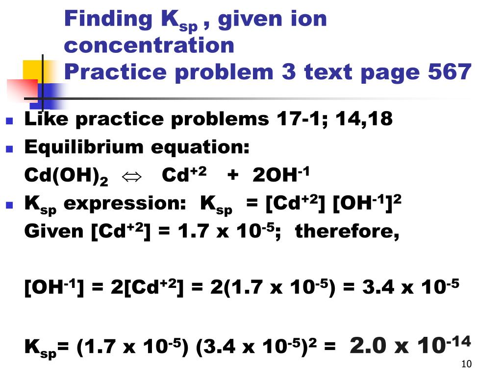 Finding Ksp , given ion concentration Practice problem 3 text page 567 • Like practice problems 17-1; 14,18 • Equilibrium equation: • Cd(OH)2 Cd+2 + 2OH-1 • Ksp expression: Ksp = [Cd+2] [OH-1]2 • Given [Cd+2] = 1.7 x 10-5; therefore, • [OH-1] = 2[Cd+2] = 2(1.7 x 10-5) = 3.4 x 10-5 • Ksp= (1.7 x 10-5) (3.4 x 10-5)2 = 2.0 x 10-14
