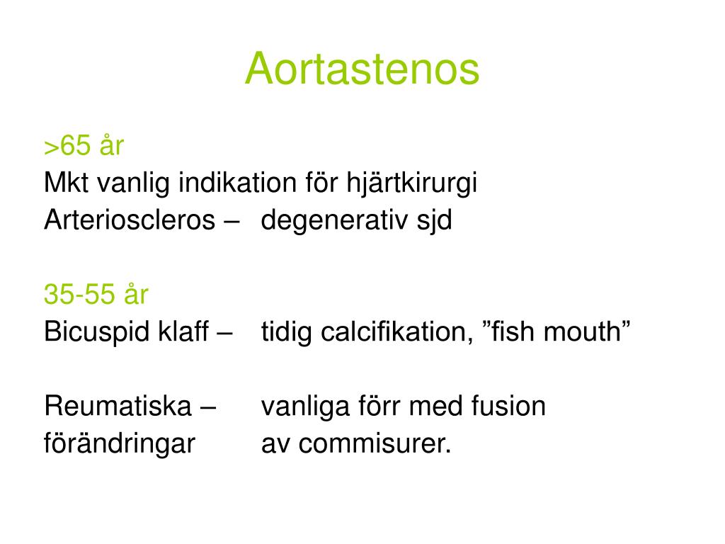 Aortastenos >65 år Mkt vanlig indikation för hjärtkirurgi Arterioscleros – degenerativ sjd 35-55 år Bicuspid klaff – tidig calcifikation, ”fish mouth” Reumatiska – vanliga förr med fusion förändringar av commisurer.