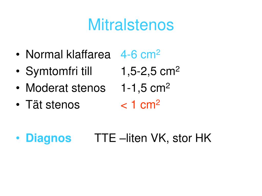 Mitralstenos • Normal klaffarea 4-6 cm2 • Symtomfri till 1,5-2,5 cm2 • Moderat stenos 1-1,5 cm2 • Tät stenos < 1 cm2 • Diagnos TTE –liten VK, stor HK