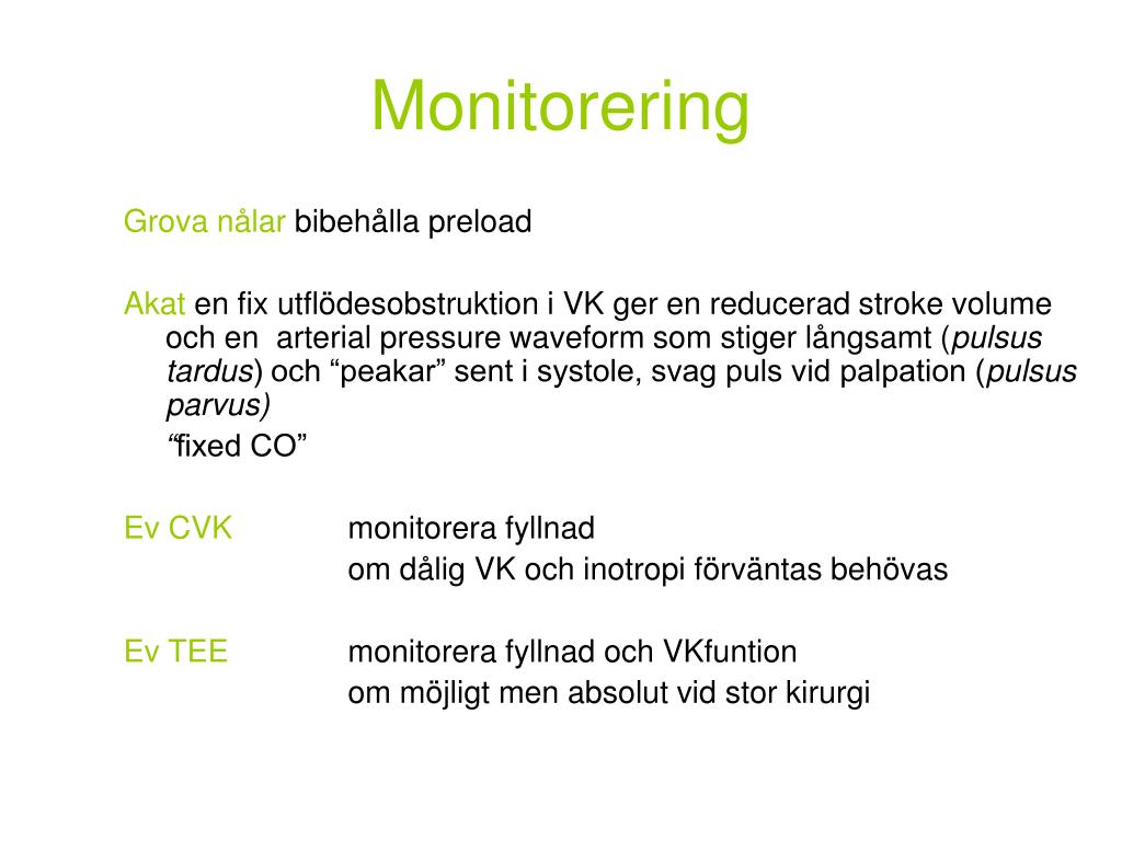 Grova nålar bibehålla preload Akat en fix utflödesobstruktion i VK ger en reducerad stroke volume och en arterial pressure waveform som stiger långsamt (pulsus tardus) och “peakar” sent i systole, svag puls vid palpation (pulsus parvus) “fixed CO” Ev CVK monitorera fyllnad om dålig VK och inotropi förväntas behövas Ev TEE monitorera fyllnad och VKfuntion om möjligt men absolut vid stor kirurgi Monitorering