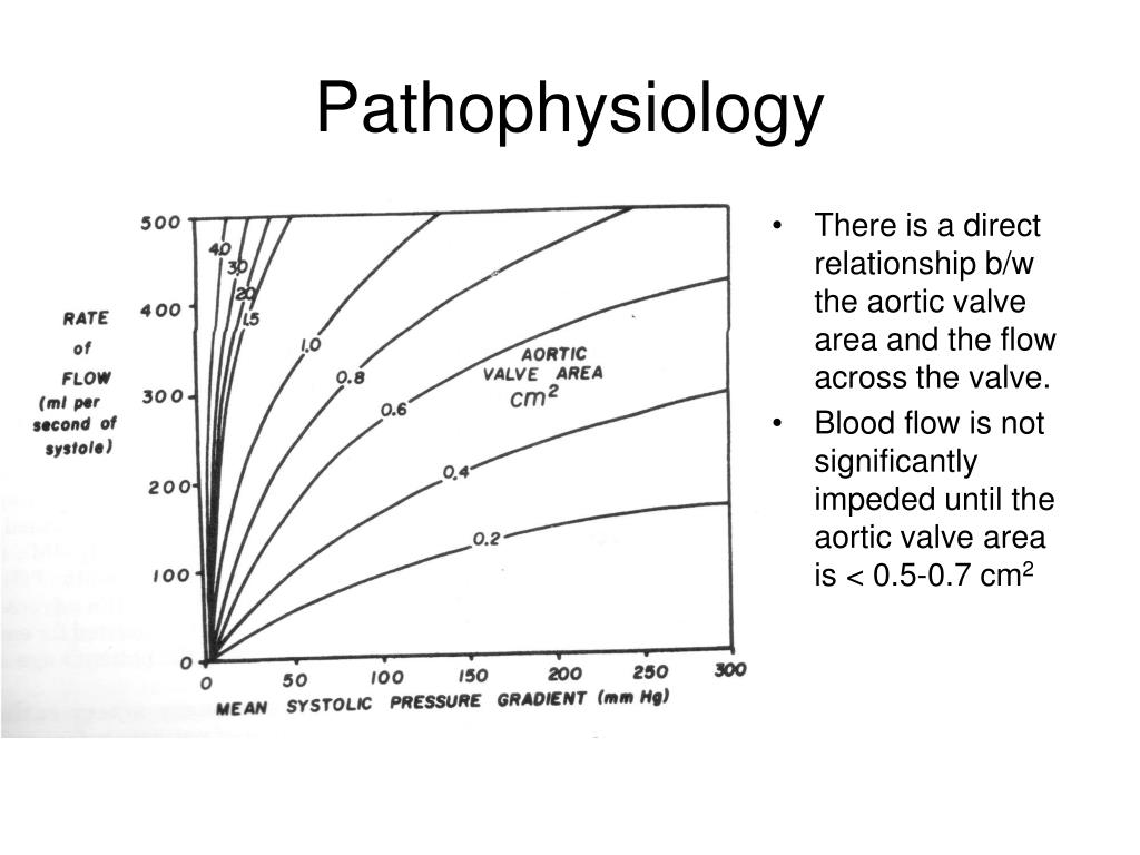 There is a direct relationship b/w the aortic valve area and the flow across the valve. Blood flow is not significantly impeded until the aortic valve area is < 0.5-0.7 cm2 Pathophysiology