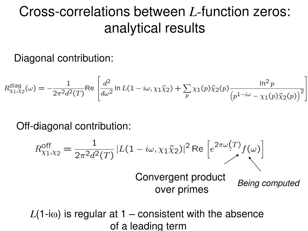 Cross-correlations between L-function zeros:analytical results Diagonal contribution: Off-diagonal contribution: Convergent product over primes Being computed L(1-i) is regular at 1 – consistent with the absence of a leading term