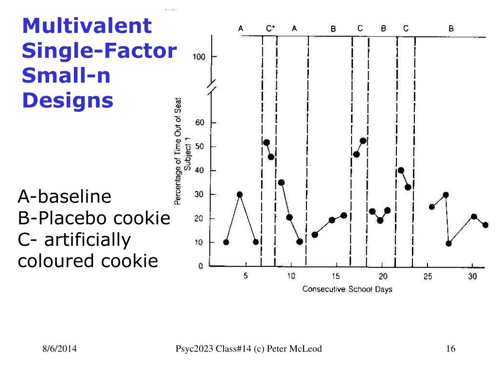 Multivalent Single-Factor Small-n Designs A-baseline B-Placebo cookie C- artificially coloured cookie Psyc2023 Class#14 (c) Peter McLeod