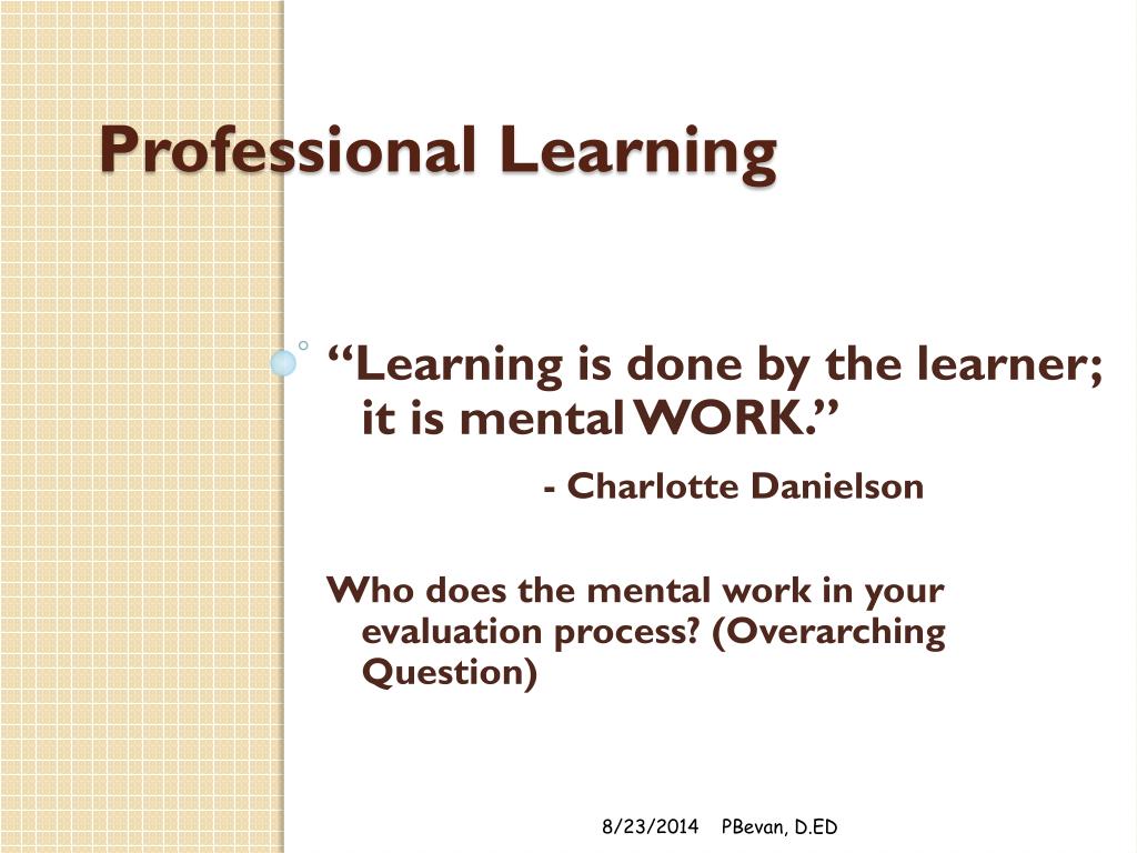 Professional Learning “Learning is done by the learner; it is mental WORK.” - Charlotte Danielson Who does the mental work in your evaluation process? (Overarching Question) 8/23/2014 PBevan, D.ED