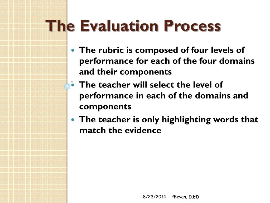 The Evaluation Process The rubric is composed of four levels of performance for each of the four domains and their components The teacher will select the level of performance in each of the domains and components The teacher is only highlighting words that match the evidence 8/23/2014 PBevan, D.ED