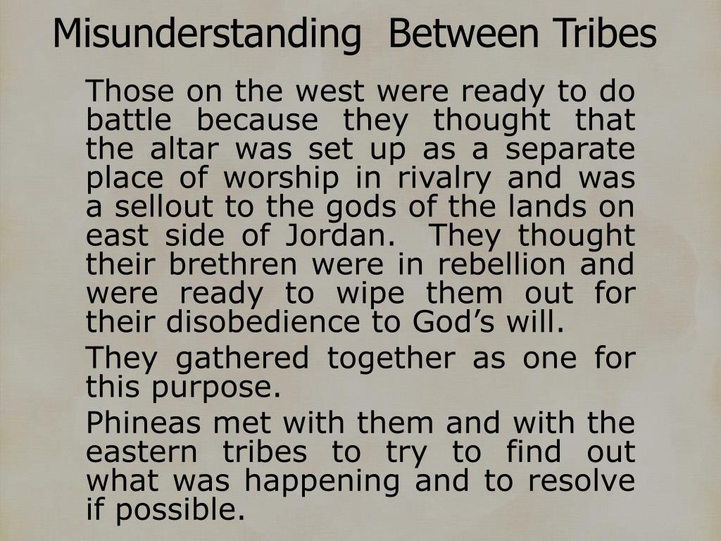 Misunderstanding Between Tribes Those on the west were ready to do battle because they thought that the altar was set up as a separate place of worship in rivalry and was a sellout to the gods of the lands on east side of Jordan. They thought their brethren were in rebellion and were ready to wipe them out for their disobedience to God’s will. They gathered together as one for this purpose. Phineas met with them and with the eastern tribes to try to find out what was happening and to resolve if possible.