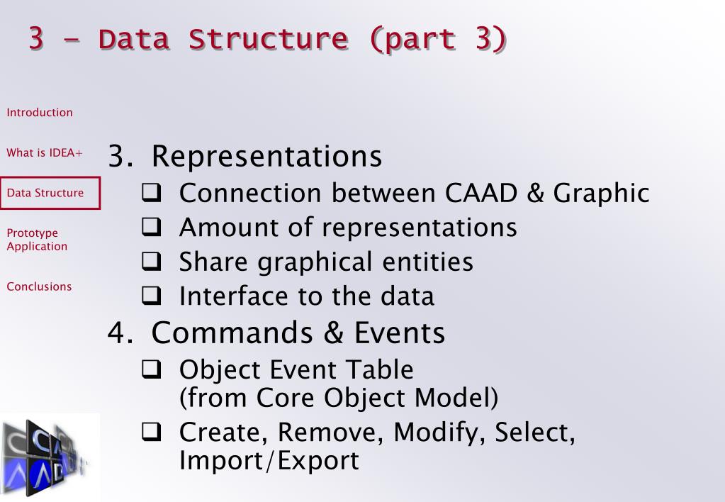 3 – Data Structure (part 3) • Representations • Connection between CAAD & Graphic • Amount of representations • Share graphical entities • Interface to the data • Commands & Events • Object Event Table(from Core Object Model) • Create, Remove, Modify, Select, Import/Export