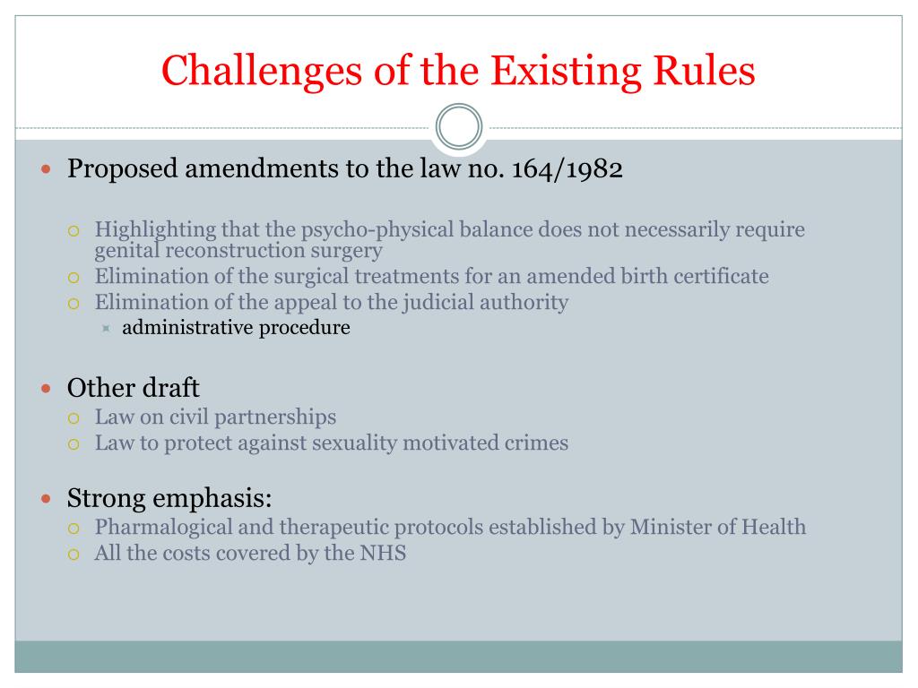 Challenges of theExistingRules • Proposed amendments to the law no. 164/1982 • Highlighting that the psycho-physical balance does not necessarily require genital reconstruction surgery • Elimination of the surgical treatments for an amended birth certificate • Elimination of the appeal to the judicial authority • administrative procedure • Other draft • Law on civil partnerships • Law to protectagainstsexualitymotivatedcrimes • Strong emphasis: • Pharmalogical and therapeutic protocols established by Minister of Health • All the costs covered by the NHS