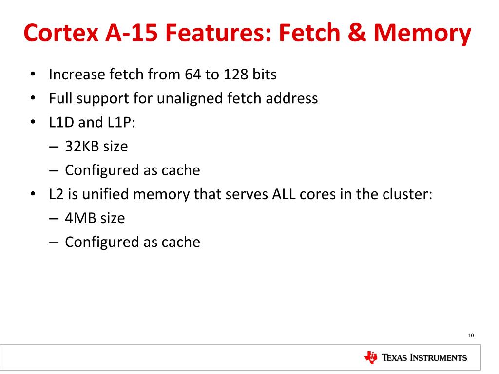 Cortex A-15 Features: Fetch & Memory • Increase fetch from 64 to 128 bits • Full support for unaligned fetch address • L1D and L1P: • 32KB size • Configured as cache • L2 is unified memory that serves ALL cores in the cluster: • 4MB size • Configured as cache
