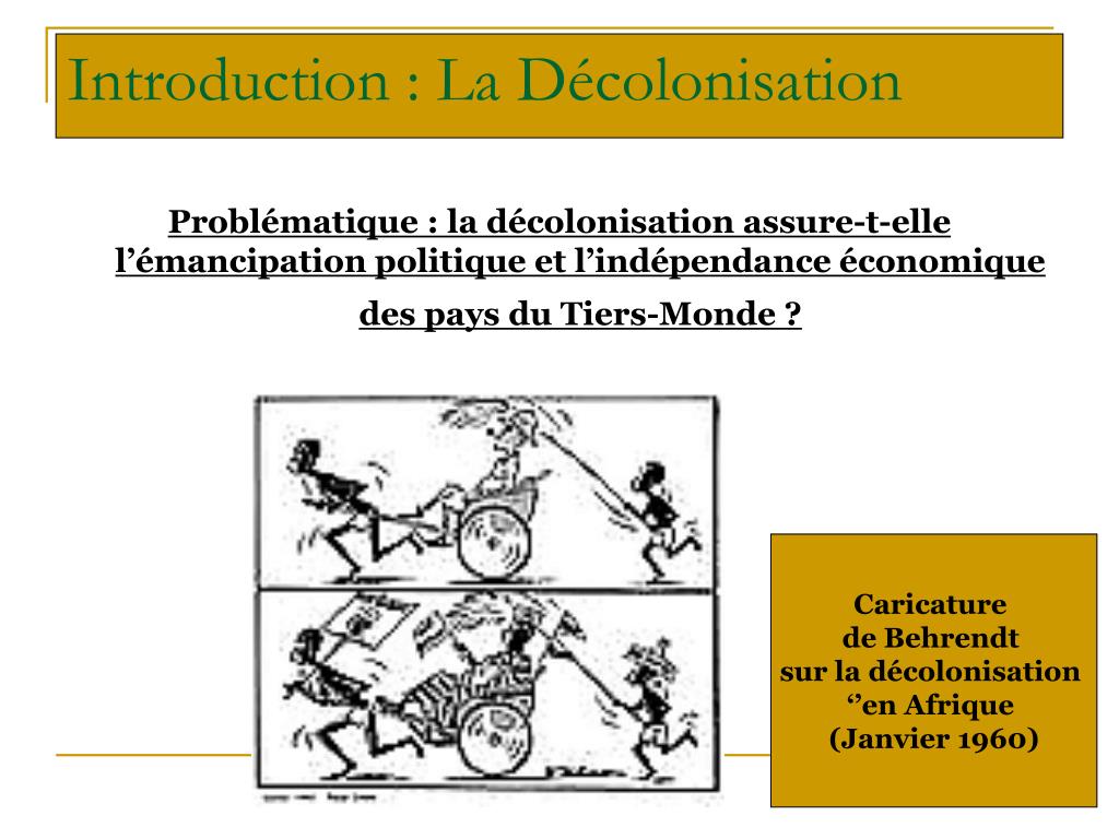 Introduction : La Décolonisation Problématique : la décolonisation assure-t-elle l’émancipation politique et l’indépendance économique des pays du Tiers-Monde ? Caricature de Behrendt sur la décolonisation ‘’en Afrique (Janvier 1960)
