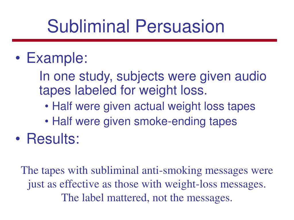 Subliminal Persuasion • Example: In one study, subjects were given audio tapes labeled for weight loss. • Half were given actual weight loss tapes • Half were given smoke-ending tapes • Results: The tapes with subliminal anti-smoking messages were just as effective as those with weight-loss messages. The label mattered, not the messages.