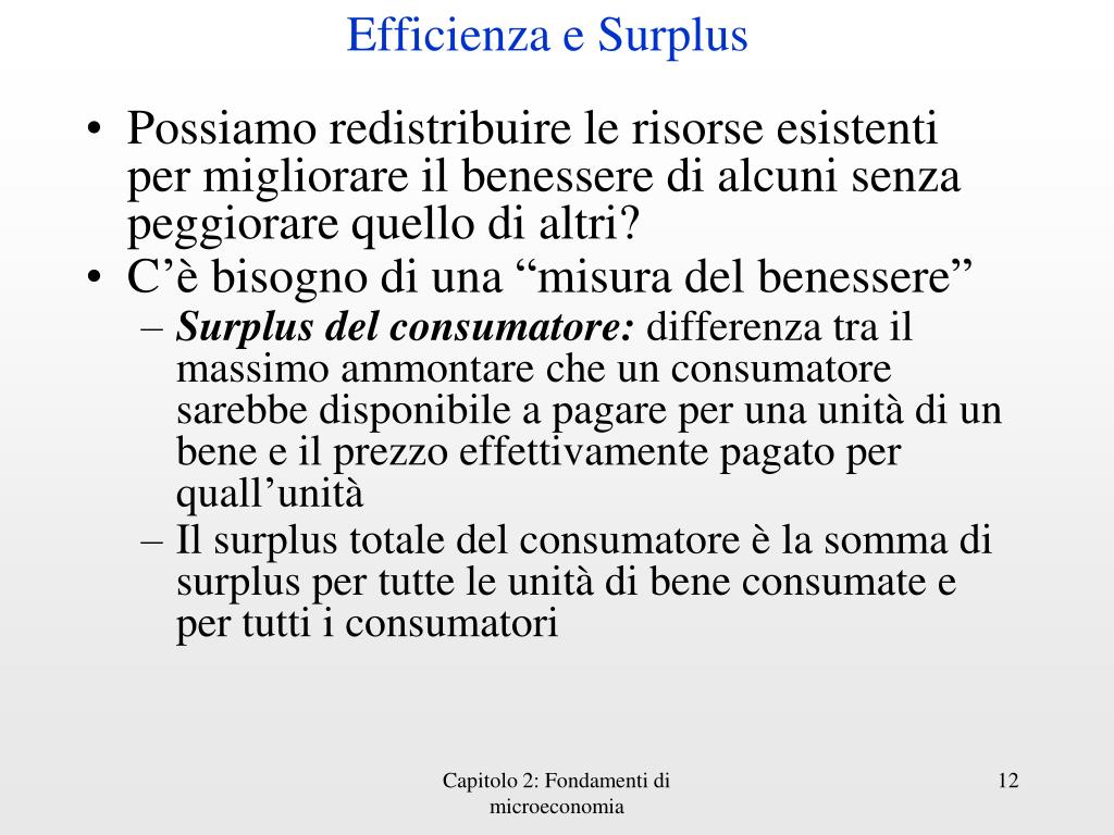 Efficienza e Surplus • Possiamoredistribuire le risorseesistenti per migliorareilbenesseredialcunisenzapeggiorarequellodialtri? • C’èbisognodiuna “misura del benessere” • Surplus del consumatore: differenzatrailmassimoammontareche un consumatoresarebbedisponibile a pagare per unaunitàdi un bene e ilprezzoeffettivamentepagato per quall’unità • Il surplus totale del consumatore è la sommadi surplus per tutte le unitàdibeneconsumate e per tuttiiconsumatori Capitolo 2: Fondamenti di microeconomia