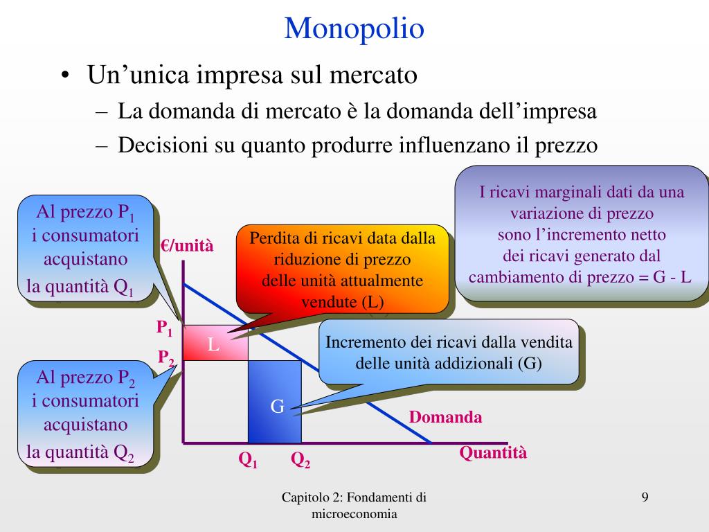 Monopolio • Un’unicaimpresasulmercato • La domandadimercato è la domandadell’impresa • Decisionisuquantoprodurreinfluenzanoilprezzo I ricavimarginalidatidaunavariazionediprezzosonol’incrementonettodeiricavigeneratodalcambiamentodiprezzo = G - L Al prezzo P1 iconsumatoriacquistanola quantità Q1 Perditadiricavi data dallariduzionediprezzodelleunitàattualmentevendute (L) €/unità P1 Incrementodeiricavidallavenditadelleunitàaddizionali (G) L P2 Al prezzo P2 iconsumatoriacquistanola quantità Q2 G Domanda Quantità Q1 Q2 Capitolo 2: Fondamenti di microeconomia