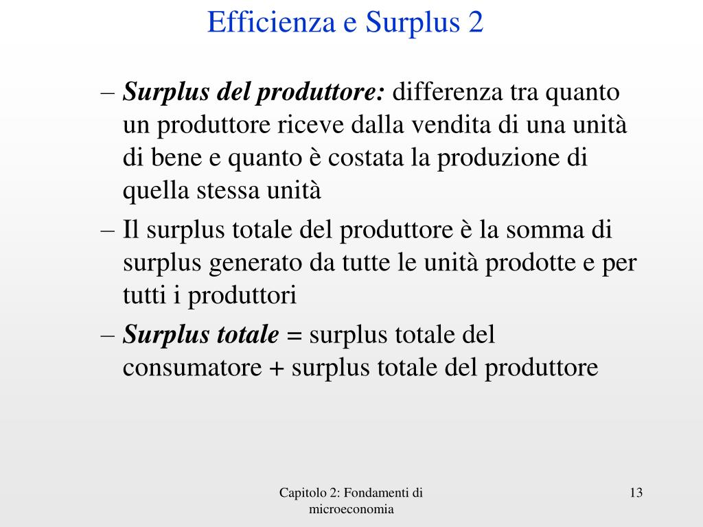 Efficienza e Surplus 2 • Surplus del produttore:differenzatraquanto un produttorericevedallavenditadiunaunitàdibene e quanto è costata la produzionediquellastessaunità • Il surplus totale del produttore è la sommadi surplus generatodatutte le unitàprodotte e per tuttiiproduttori • Surplus totale= surplus totale del consumatore + surplus totale del produttore Capitolo 2: Fondamenti di microeconomia