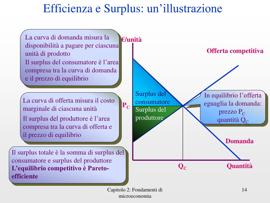 Efficienza e Surplus: un’illustrazione La curva di domanda misura la disponibilità a pagare per ciascuna unità di prodotto €/unità Offertacompetitiva Il surplus del consumatore è l’area compresa tra la curva di domanda e il prezzo di equilibrio Surplus delconsumatore In equilibriol’offertaeguaglia la domanda:prezzo PC quantità QC La curva di offerta misura il costo marginale di ciascuna unità PC Surplus delproduttore Il surplus del produttore è l’area compresa tra la curva di offerta e il prezzo di equilibrio Domanda Il surplus totale è la somma di surplus del consumatore e surplus del produttore QC Quantità L’equilibrio competitivo è Pareto-efficiente Capitolo 2: Fondamenti di microeconomia