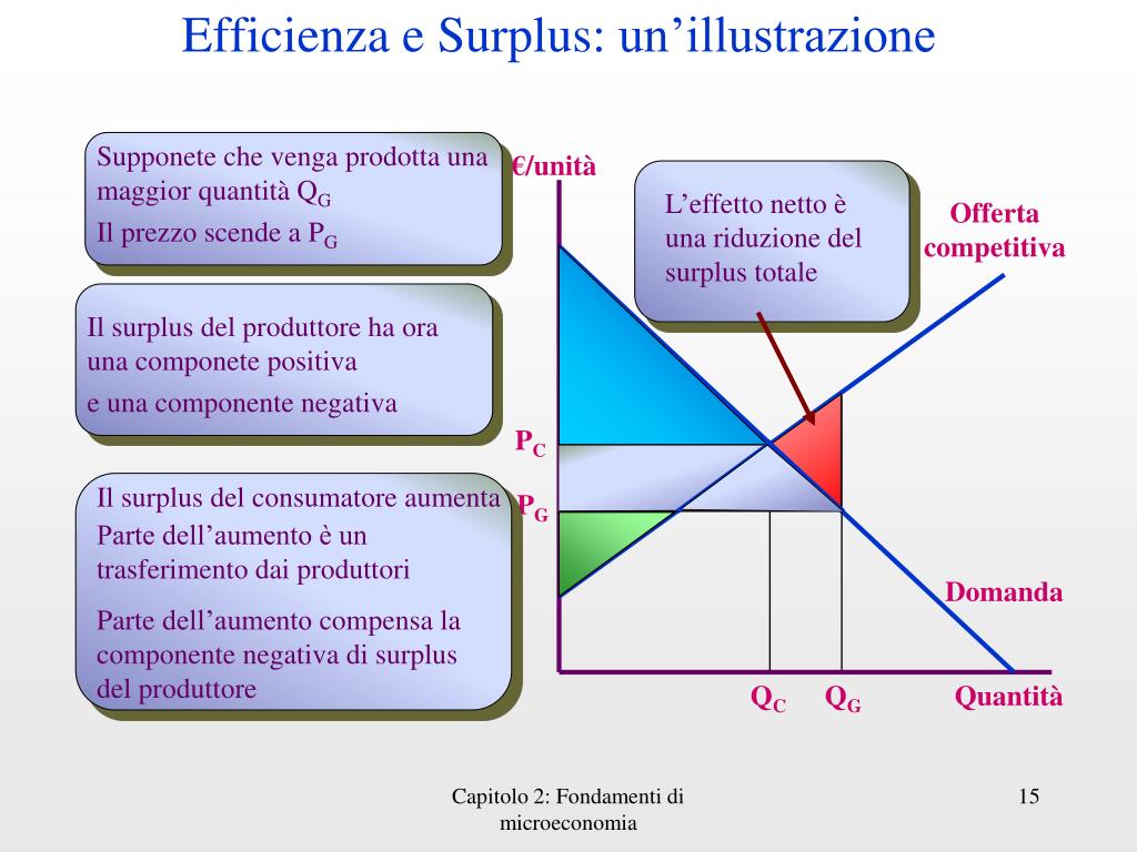 Efficienza e Surplus: un’illustrazione Supponete che venga prodotta una maggior quantità QG €/unità L’effettonetto è unariduzione del surplus totale Offerta competitiva Il prezzo scende a PG Il surplus del produttore ha ora una componete positiva e una componente negativa PC Il surplus del consumatore aumenta PG Parte dell’aumento è un trasferimento dai produttori Domanda Parte dell’aumentocompensa la componentenegativadi surplus del produttore QC QG Quantità Capitolo 2: Fondamenti di microeconomia
