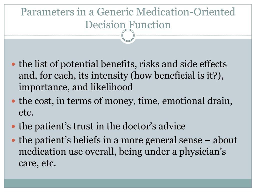 Parameters in a Generic Medication-Oriented Decision Function the list of potential benefits, risks and side effects and, for each, its intensity (how beneficial is it?), importance, and likelihood the cost, in terms of money, time, emotional drain, etc. the patient’s trust in the doctor’s advice the patient’s beliefs in a more general sense – about medication use overall, being under a physician’s care, etc.