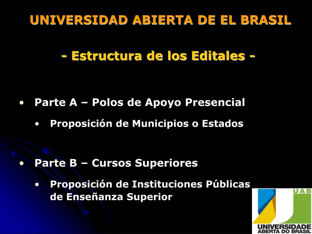 UNIVERSIDAD ABIERTA DE EL BRASIL - Estructura de los Editales - • Parte A – Polos de Apoyo Presencial • Proposición de Municipios o Estados • Parte B – Cursos Superiores • Proposición de Instituciones Públicas de Enseñanza Superior