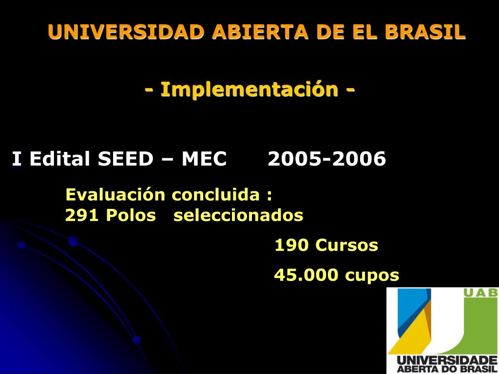 UNIVERSIDAD ABIERTA DE EL BRASIL - Implementación - I Edital SEED – MEC 2005-2006 Evaluación concluida : 291 Polos seleccionados 190 Cursos 45.000 cupos