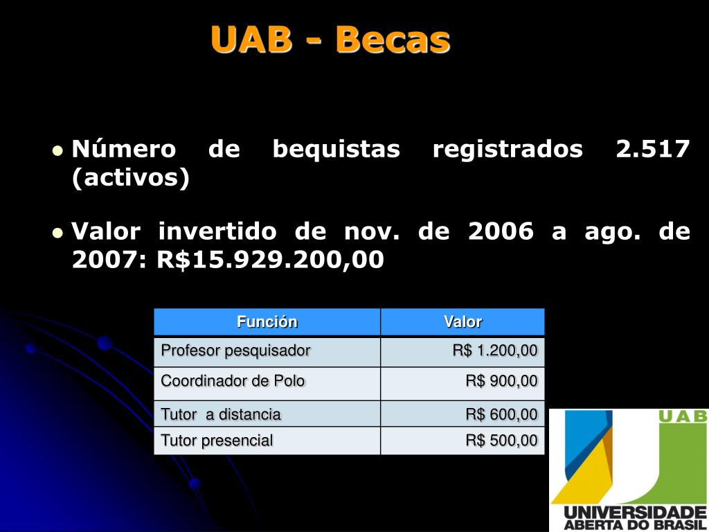UAB - Becas Número de bequistas registrados 2.517 (activos) Valor invertido de nov. de 2006 a ago. de 2007: R$15.929.200,00