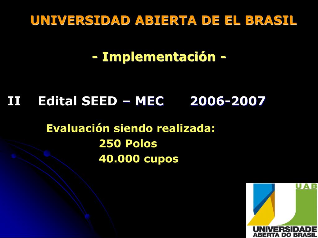 UNIVERSIDAD ABIERTA DE EL BRASIL - Implementación - II Edital SEED – MEC 2006-2007 Evaluación siendo realizada: 250 Polos 40.000 cupos
