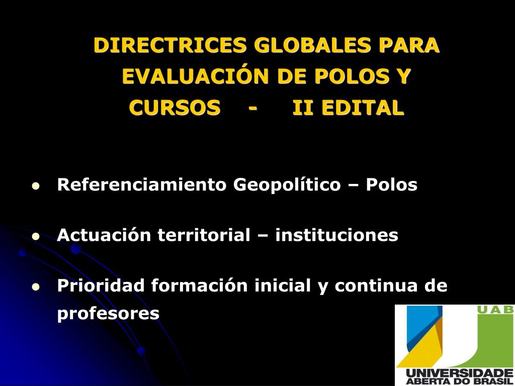 DIRECTRICES GLOBALES PARA EVALUACIÓN DE POLOS Y CURSOS - II EDITAL • Referenciamiento Geopolítico – Polos • Actuación territorial – instituciones • Prioridad formación inicial y continua de profesores