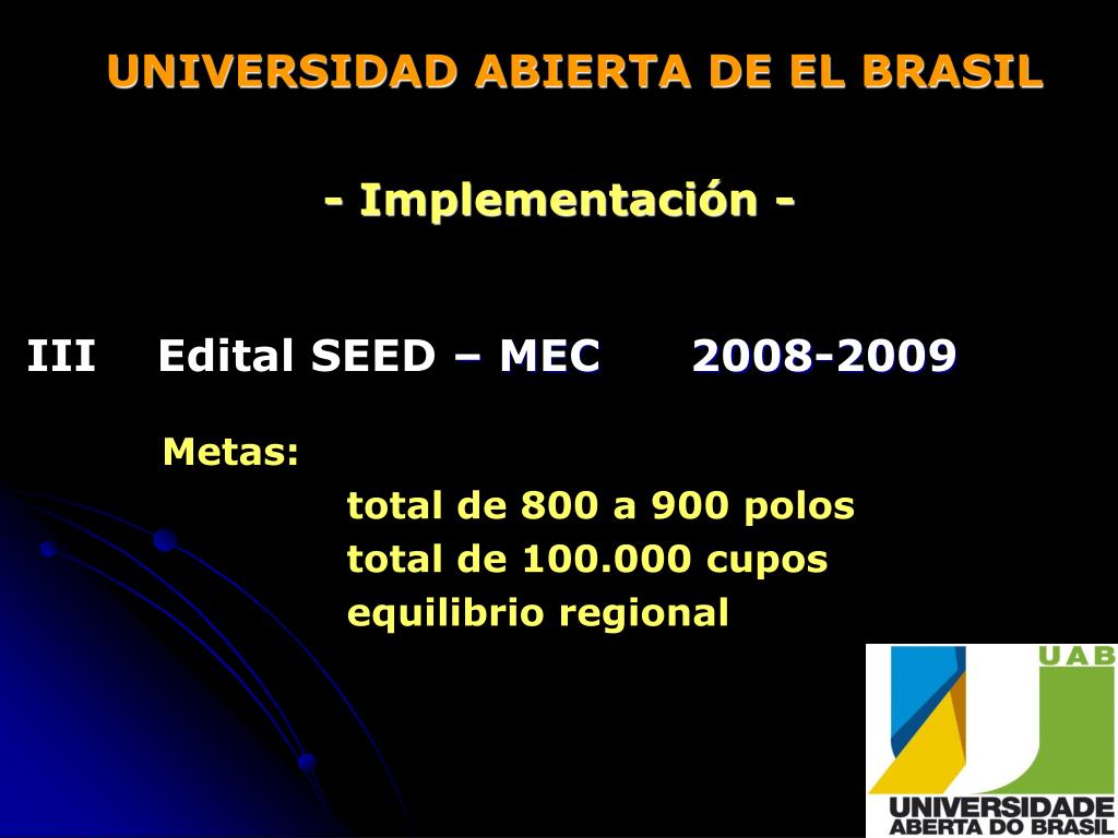 UNIVERSIDAD ABIERTA DE EL BRASIL - Implementación - III Edital SEED – MEC 2008-2009 Metas: total de 800 a 900 polos total de 100.000 cupos equilibrio regional