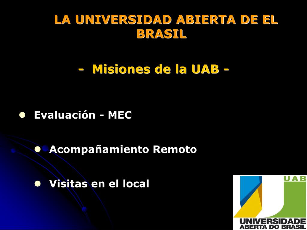 LA UNIVERSIDAD ABIERTA DE EL BRASIL - Misiones de la UAB - • Evaluación - MEC • Acompañamiento Remoto • Visitas en el local