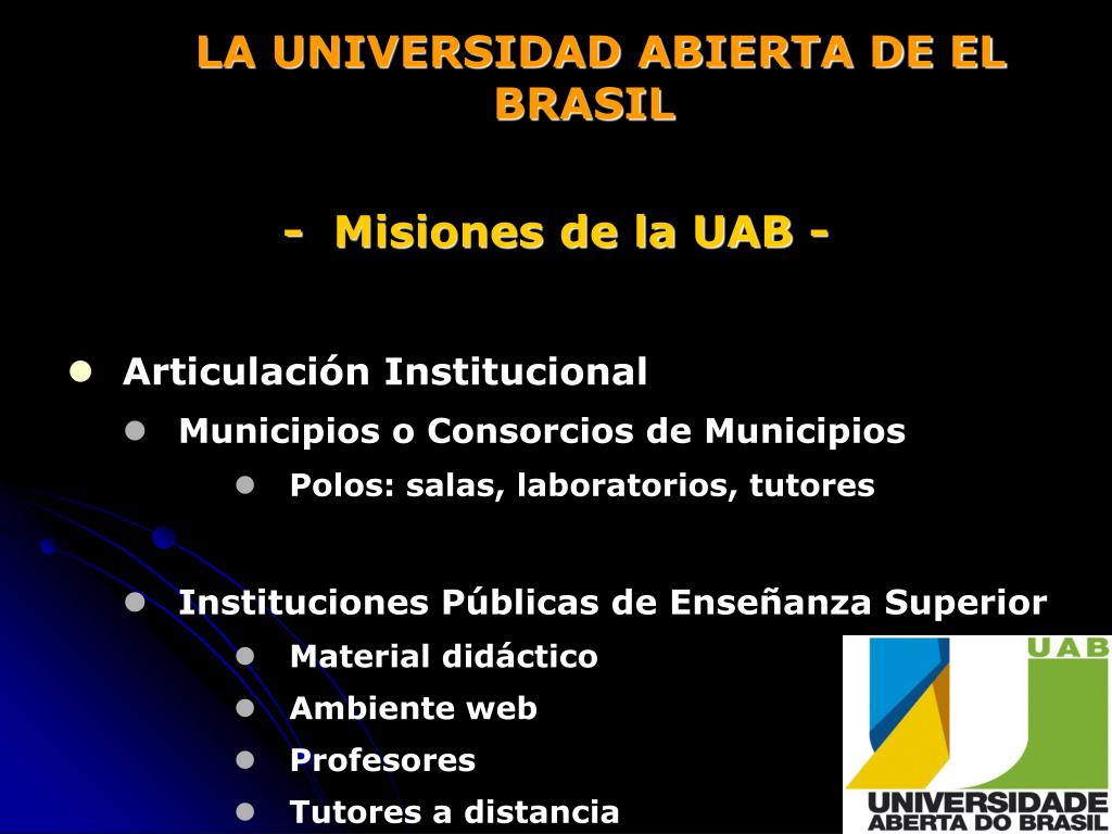 LA UNIVERSIDAD ABIERTA DE EL BRASIL - Misiones de la UAB - • Articulación Institucional • Municipios o Consorcios de Municipios • Polos: salas, laboratorios, tutores • Instituciones Públicas de Enseñanza Superior • Material didáctico • Ambiente web • Profesores • Tutores a distancia