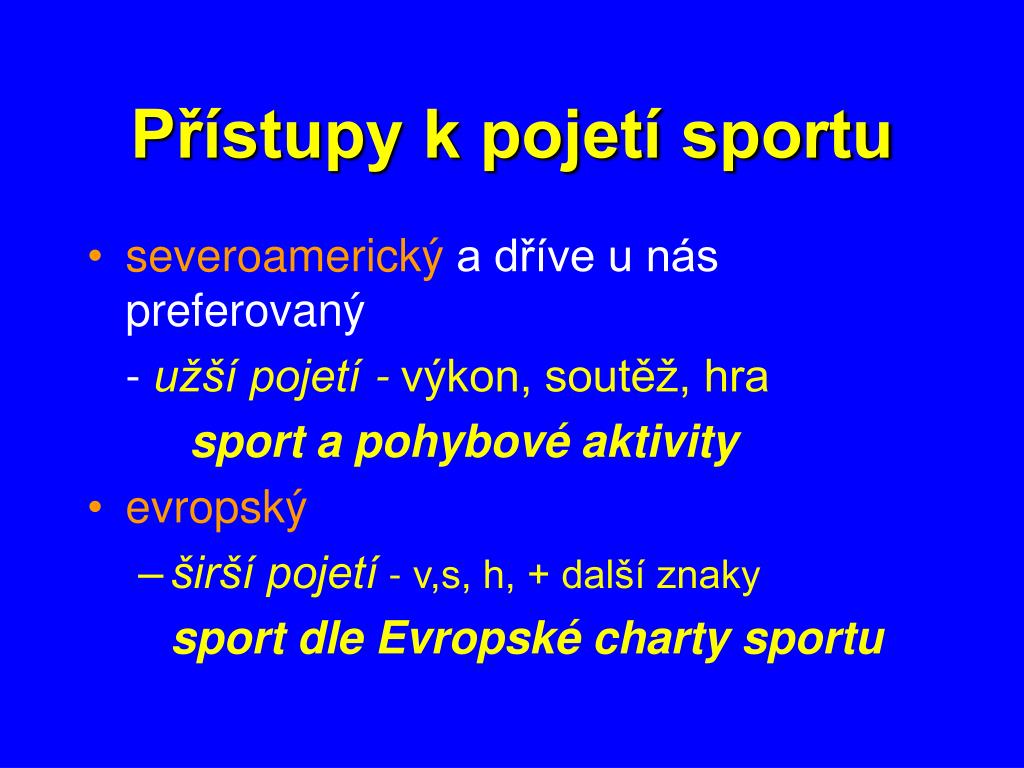 Přístupy k pojetí sportu • severoamerický a dříve u nás preferovaný - užší pojetí - výkon, soutěž, hra sport a pohybové aktivity • evropský • širší pojetí- v,s, h, + další znaky sport dle Evropské charty sportu