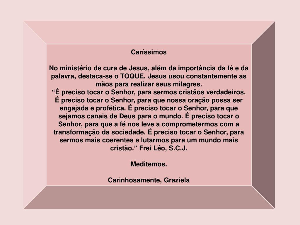 Caríssimos No ministério de cura de Jesus, além da importância da fé e da palavra, destaca-se o TOQUE. Jesus usou constantemente as mãos para realizar seus milagres. “É preciso tocar o Senhor, para sermos cristãos verdadeiros. É preciso tocar o Senhor, para que nossa oração possa ser engajada e profética. É preciso tocar o Senhor, para que sejamos canais de Deus para o mundo. É preciso tocar o Senhor, para que a fé nos leve a comprometermos com a transformação da sociedade. É preciso tocar o Senhor, para sermos mais coerentes e lutarmos para um mundo mais cristão.” Frei Léo, S.C.J. Meditemos. Carinhosamente, Graziela